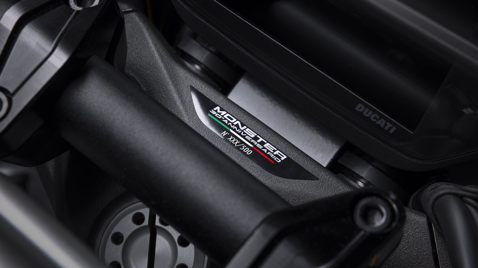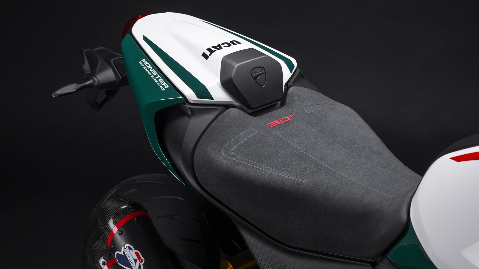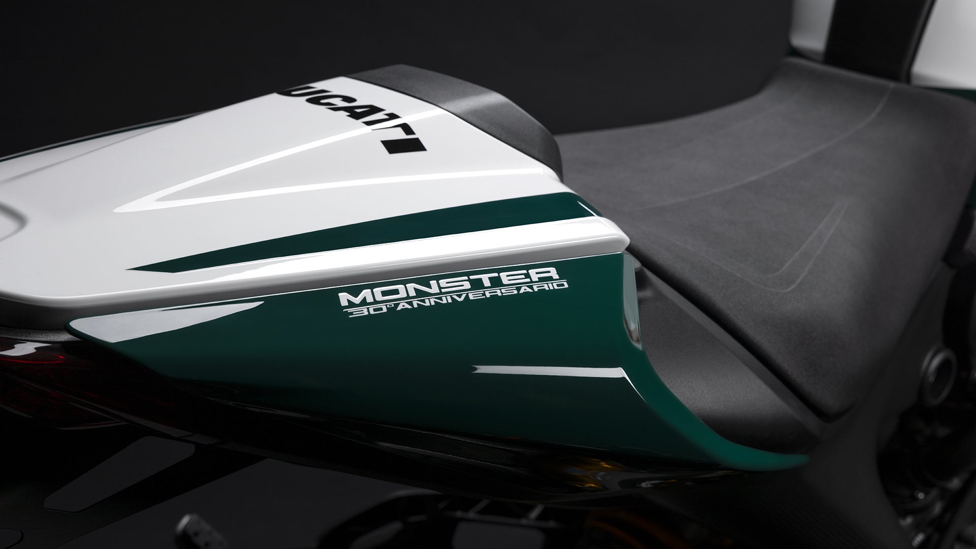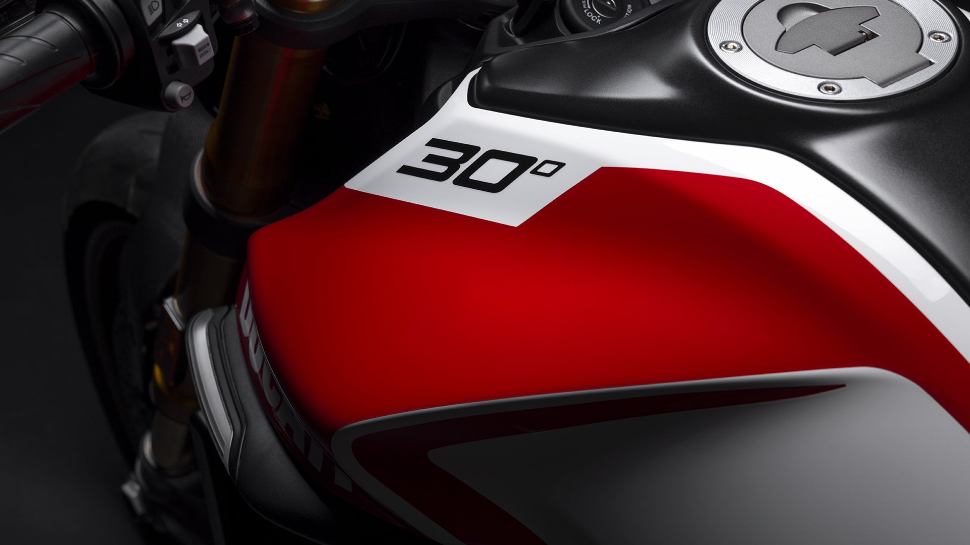 La Monster 30° Anniversario va directoa al corazón de los aficionados con su librea conmemorativa, realzada con detalles de alta calidad y un sofisticado paquete técnico que combina elegancia y actitud deportiva.