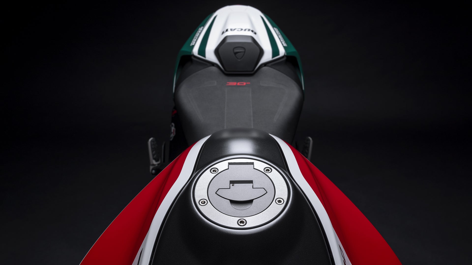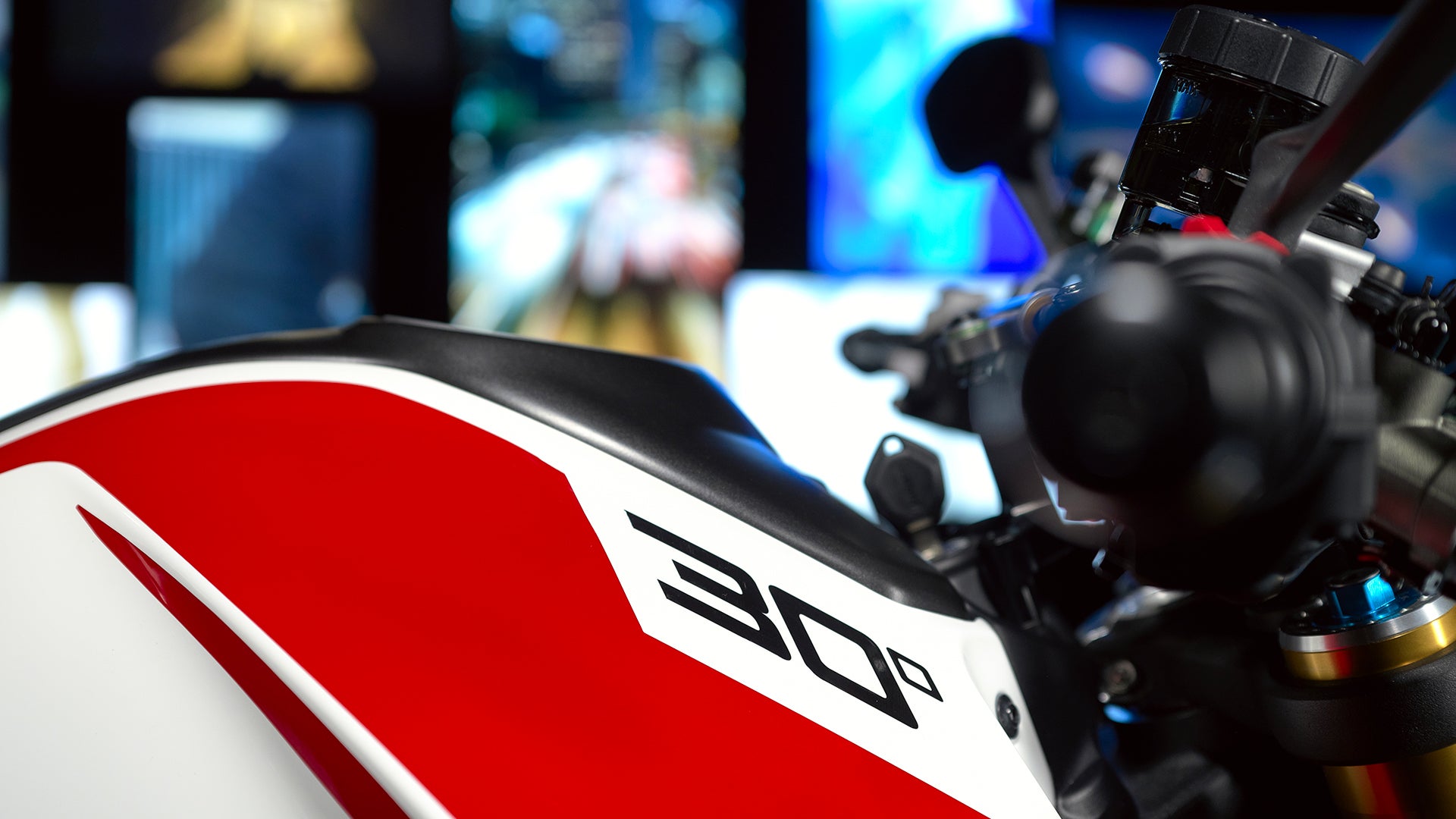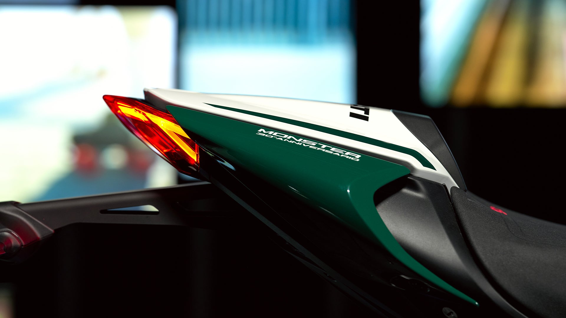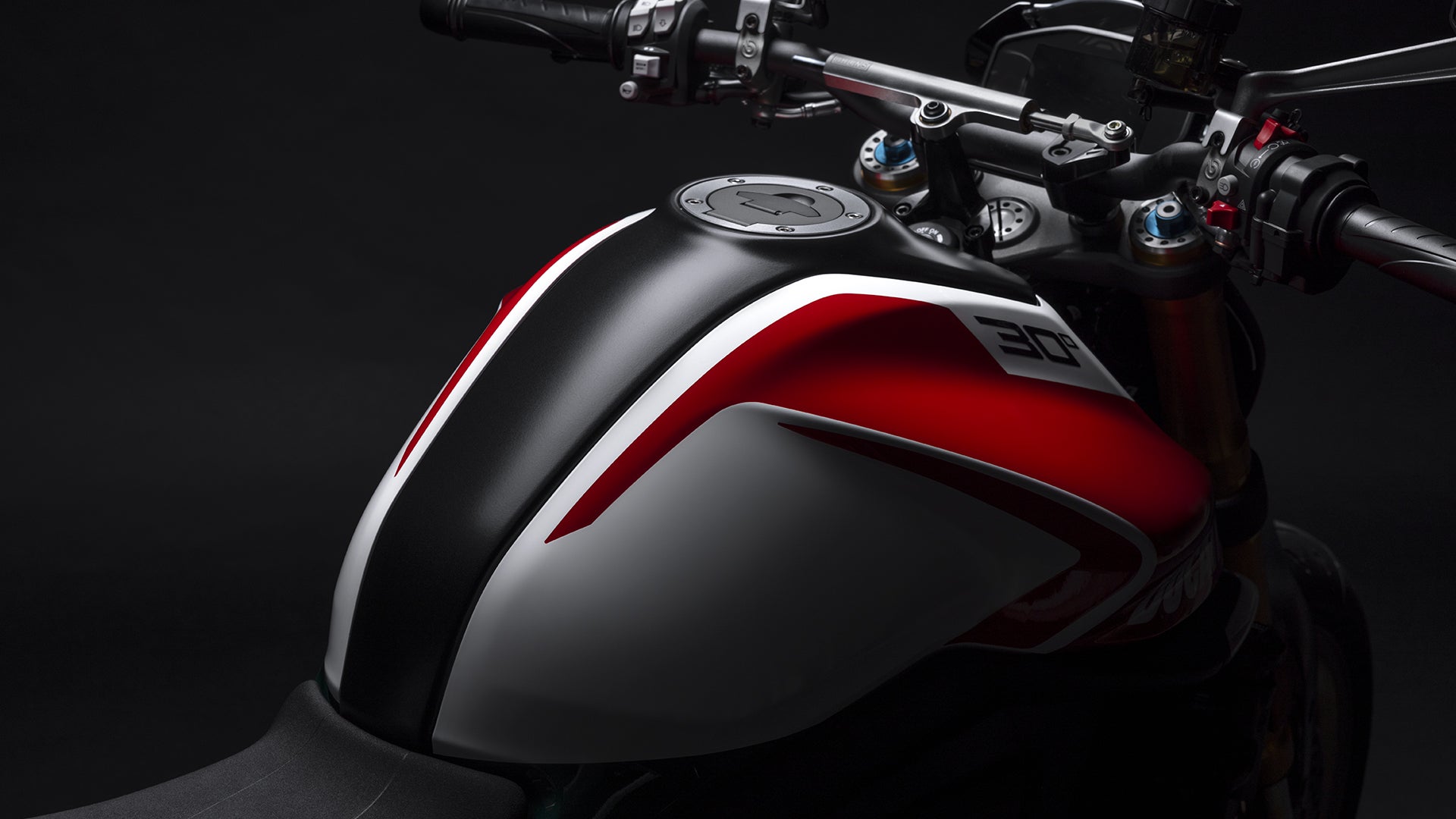 La Monster 30° Anniversario va directoa al corazón de los aficionados con su librea conmemorativa, realzada con detalles de alta calidad y un sofisticado paquete técnico que combina elegancia y actitud deportiva.
